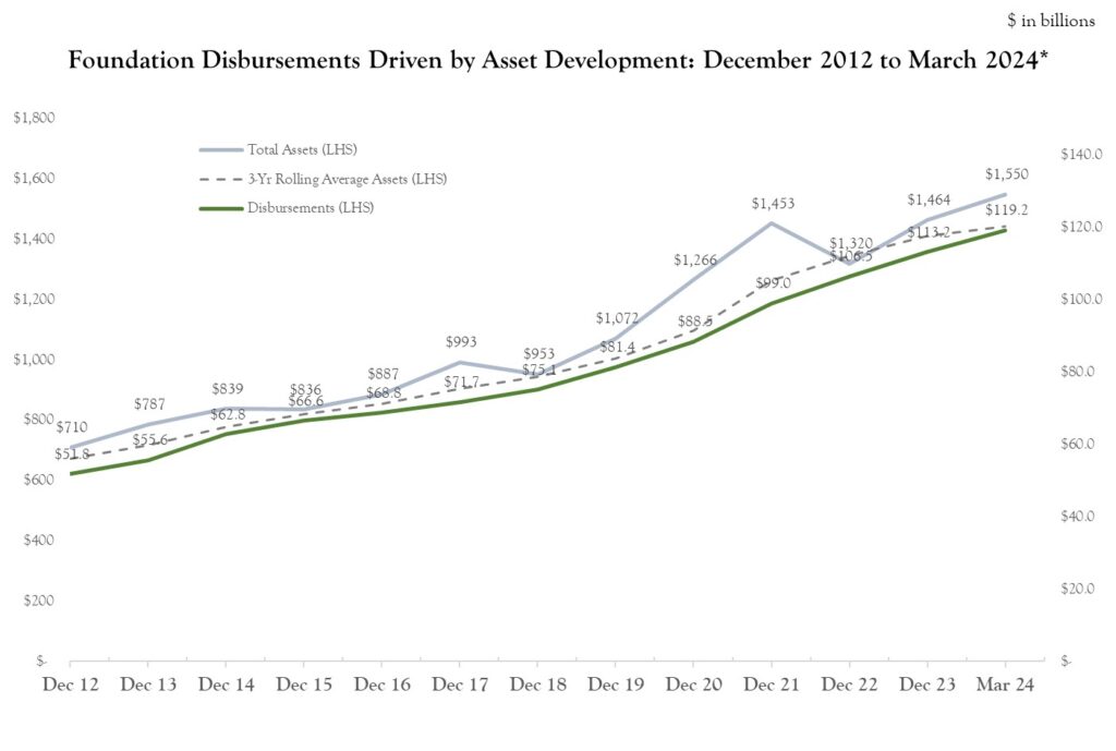 Disbursement projections are a function of two variables; 1) asset level, and 2) payout ratio. Estimated March 2024 foundation assets reached a record $1.55 trillion, up $230 billion from 2022.