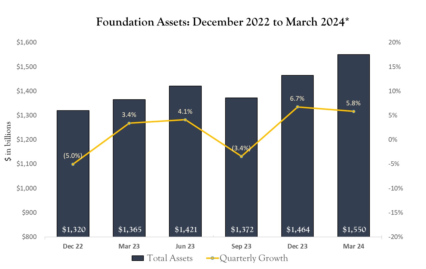 FoundationMark models indicate that U.S. foundations’ assets rose by about $85 billion, or about 5.8%, in the first quarter of 2024 pushing assets to a record $1.55 trillion.