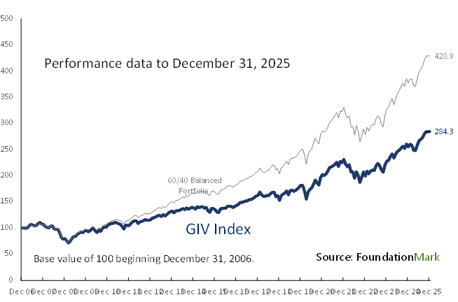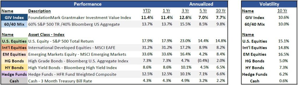The FoundationMark GIV Index is calculated using FoundationMark return estimates up to and including December 2024 thereafter monthly returns are estimated based on reported asset allocations and market returns. The GIV Index serves as a proxy for foundation performance. Actual performance may differ materially. The GIV Index is updated on a continuing basis and all data is subject to revision.