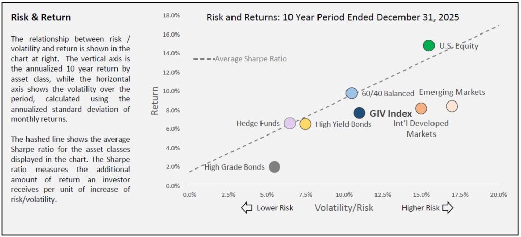 The Grantmaker Investment Value Index (“GIV”) rose 1.6% in the third quarter, bringing year-to-date gains to 11.4%. The GIV Index stood at a record high as of December 31, 2025 with 10-year returns annualized at 7.7%. However, foundations continue to lag the traditional institutional portfolio mix comprised of 60% in the S&P 500 and 40% in the Bloomberg Aggregate Index which posted annual gains of 9.8% for the decade ended December 2025.